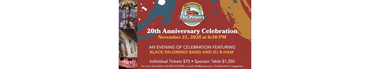 The Prizery, South Boston's beloved center for arts, culture, and community, is celebrating two decades of creativity and connection with a special 20th Anniversary Celebration on Friday, November 21, at 6:30pm.